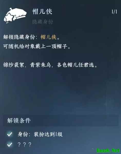 《逆水寒手游》帽儿侠身份解锁方法:解锁条件 装扮等级需要达到1级。 装扮隐藏身份:帽儿侠、幻面大师、匿影人。