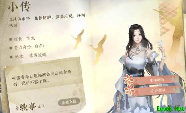 三、部分npc喜欢礼物 1、叶雪青:喜好是【生活趣物】和【花卉盆草】 2、叶问舟:喜好是【文房雅品】和【生活趣物】 3、无情:喜好是【兵术典籍】和【花卉盆草】 4、方承意:喜好【兵术典籍】和【华贵名器】 5、李师师:喜好【刀剑利器】和【兵术典籍】 6、冷血:喜好【刀剑利器】和【兵术典籍】 四、好感度等级 解锁内容: - 0-20时,为点头之谊阶段; - 20-151时,解锁:君子之交•一 - 151-201时,解锁:君子之交•二 - 201-651时,解锁:意气相倾•一 - 651-1001时,解锁:意气相倾•二 - 1001-1201时,解锁:知心着意,获得【小传】轶事三和【天赐】级别名侠一张。 - 2001时,解锁情深意重,是解锁:群侠觉醒技能的前置条件。