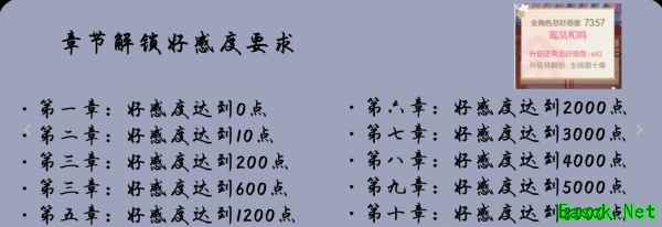 《逆水寒手游》好感度攻略大全一、好感度作用 1、每个NPC都有单独的好感度,与npc的好感度的提升时,会解锁全新的章节故事。 2、游戏好感度需求,在达到不同好感度时,解锁章节不同。 部分章节好感度解锁要求如下: