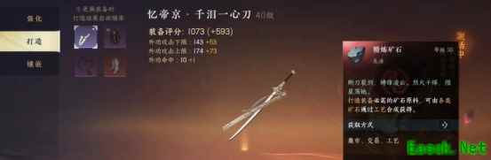 7、打造:我们可在武器、上衣、项链、鞋子4个部位进行打造,打造会消耗精炼矿石,矿石可在集市、交易行购买,也可以通过工匠身份制作,会随机在5种品质里刷新一种特技打在装备上,其中金色最佳,打造是勾选下方的添加天外陨铁可增加获得高品质特技的几率,并且保底为蓝色,天外陨铁同样可在集市与交易行购买,也可通过部分任务与分解装备获取; 最终目标就是4件装备全为金色特技战力最高(每天打造有次数限制,大家根据自身实力来选择即可);