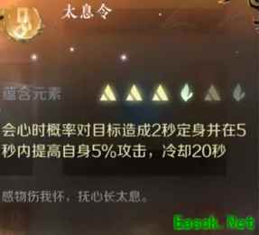 2、木元素 2级效果:减伤释放技能的10%冷却效果。 3级效果:强化本身2级基础上,获得自动减去冷却技能被动。 推荐职业:神相、碎梦、血河
