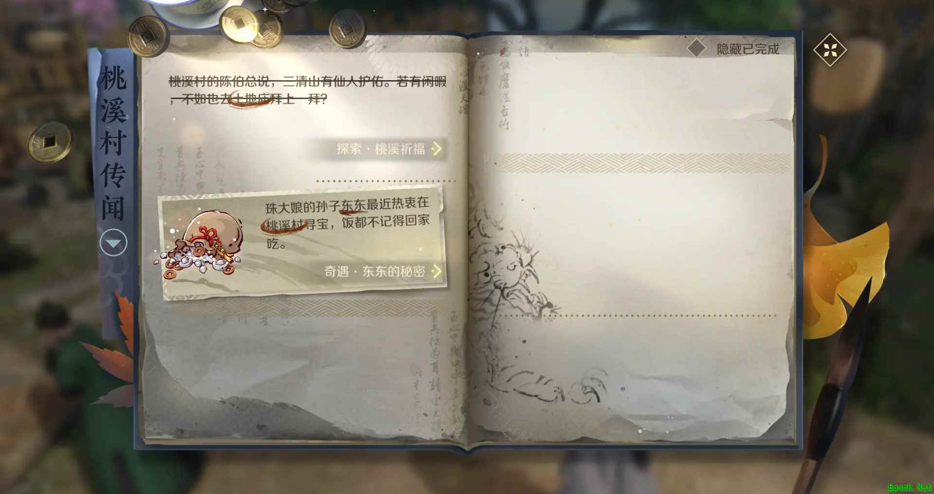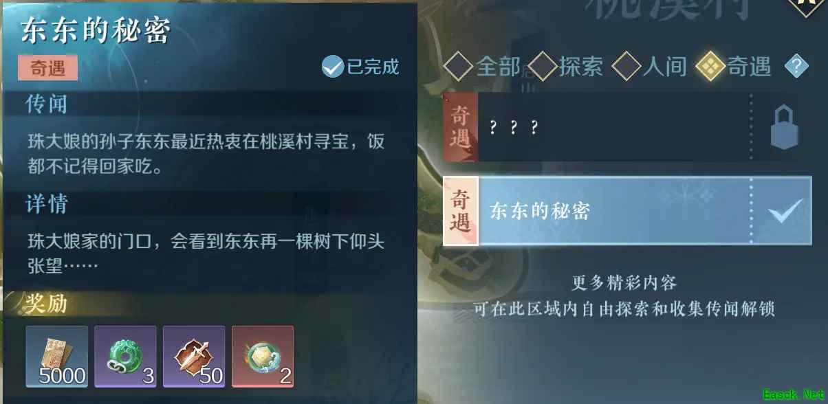 2、点开奇遇分类能看到全部奇遇,可以提前知道奇遇数量,但是只有一半左右显示名字,另外一半显示的是【???】,要触发了才会显示出名字来。 3、完成奇遇可以获得剧情点数和探索积分,分别在【菜单】-【剧情】最上方的奖励按钮、【菜单】-【开放世界】奇遇所在场景领取阶段性的奖励。 二、触发技巧 奇遇与普通任务不同,不能在山雨欲来中直接领取,需要先找到正确的触发途径,触发后自动领取,或者找到附近头顶枫叶的npc对话接任务。 1、传闻,在【菜单】-最右侧边栏【传闻】或【菜单】-【开放世界】-右上角【传闻】打开,能找到奇遇对应的传闻,对触发有一定提示,奇遇完成后传闻会被划掉,也可以快速筛选哪些奇遇还没做。 目前发现的传闻获得途径有:在世界频道蹲点,每个小时的整点半点会发一条传言消息;一些任务和氛围对话里也能获得,养成习惯多和路边npc对话、勤用望气能获得很多提示。