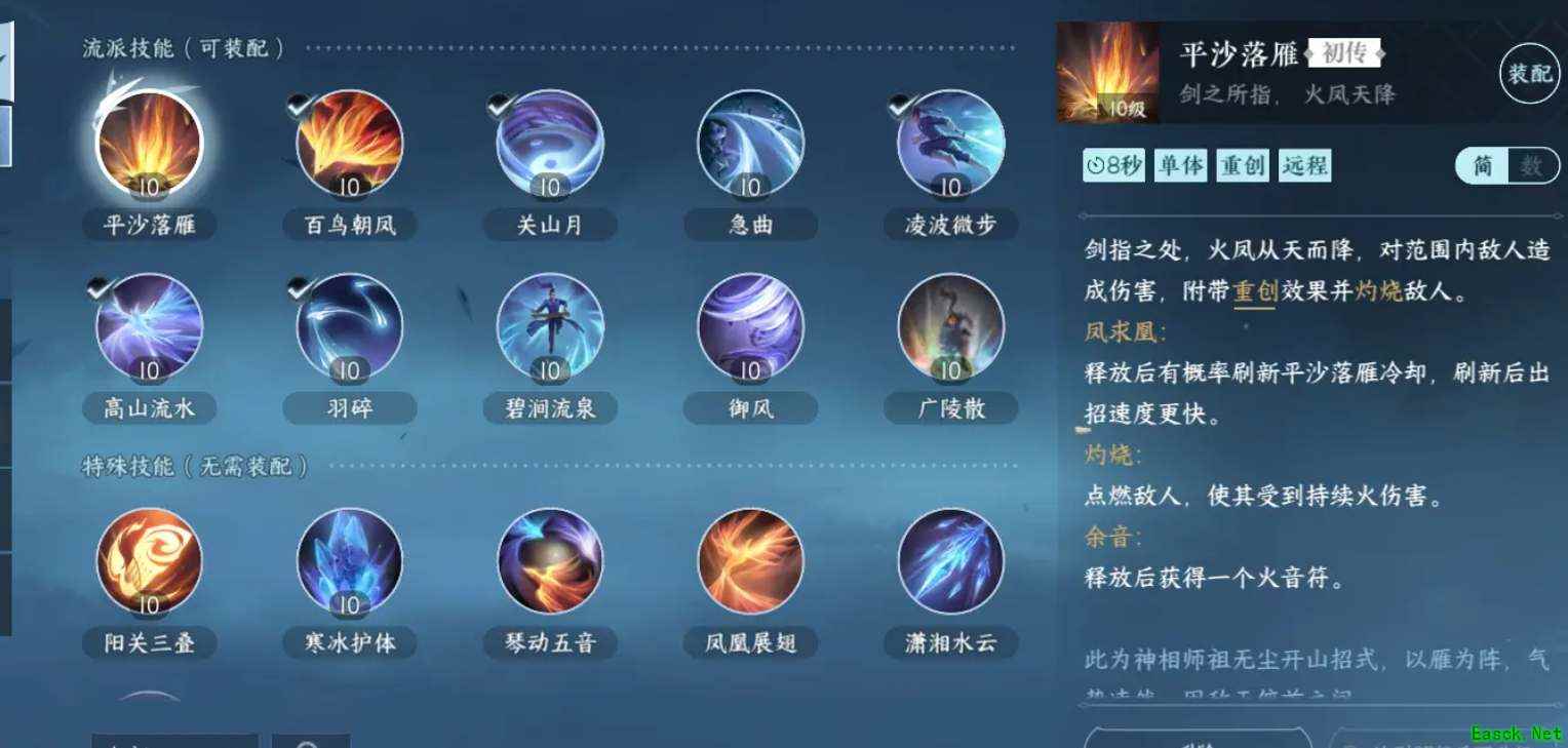 《逆水寒手游》神相技能连招搭配攻略:1、神相PVE技能搭配 技能搭配:平沙落雁+百鸟朝凤+急曲+御风+广陵散(如果队伍中其他神相带了广陵散可以把这个技能换成碧涧流泉) 绝技:灰烬冰河; 江湖技能:心眼无量+觉·千手难防; 输出手法:先使用广陵散获得增益,之后攒火音符来释放技能输即可。
