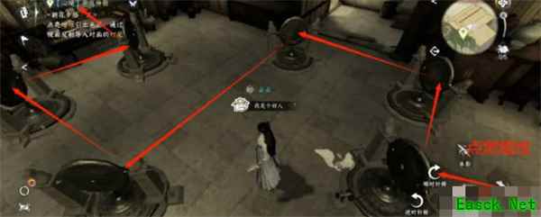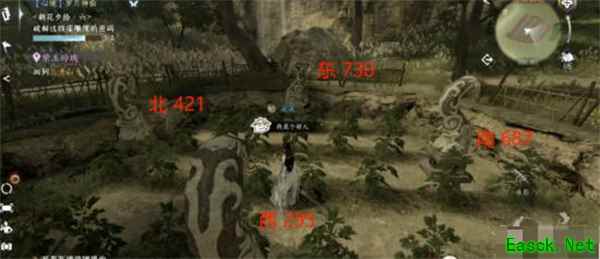 4:然后就是拨浪鼓,点击拨浪鼓会出现幻影,我们跟着他,然后打柱子,按照顺序打柱子就好了; 5:清点对应的遗物,313223,药物进行归类,红色止血散,黄色金疮药,绿色安神丸,蓝色养心丹; 6:最后解锁雕像,东730,南687,西295,北421,解锁后转动雕像是他们都面向中心。