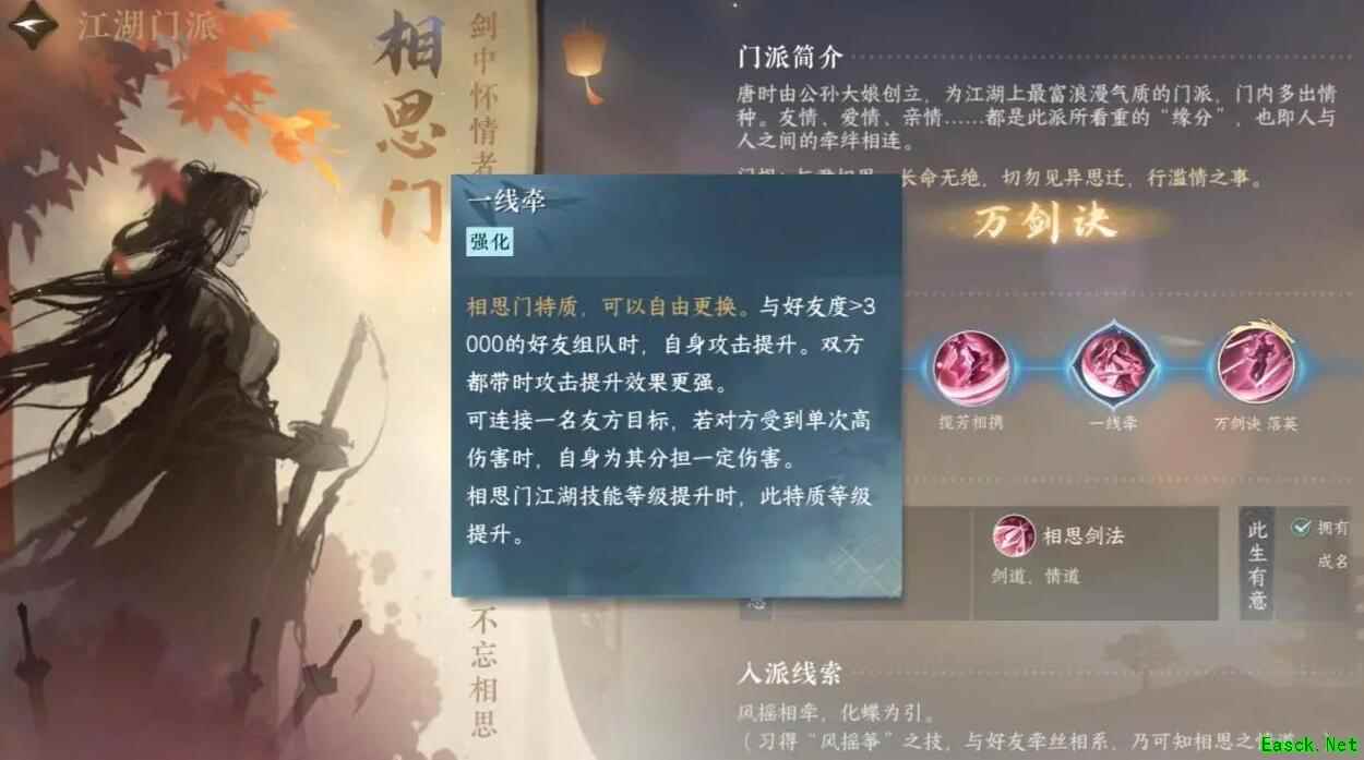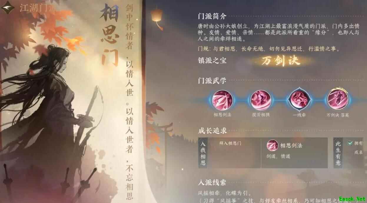 《逆水寒手游》相思门介绍武学传授坐标:桃花坞1262,615 门派传送入口:杭州942,660 一、怎么加入 线索:习得“风筝摇”之技,与好友牵丝相系,乃可知相思之情道。