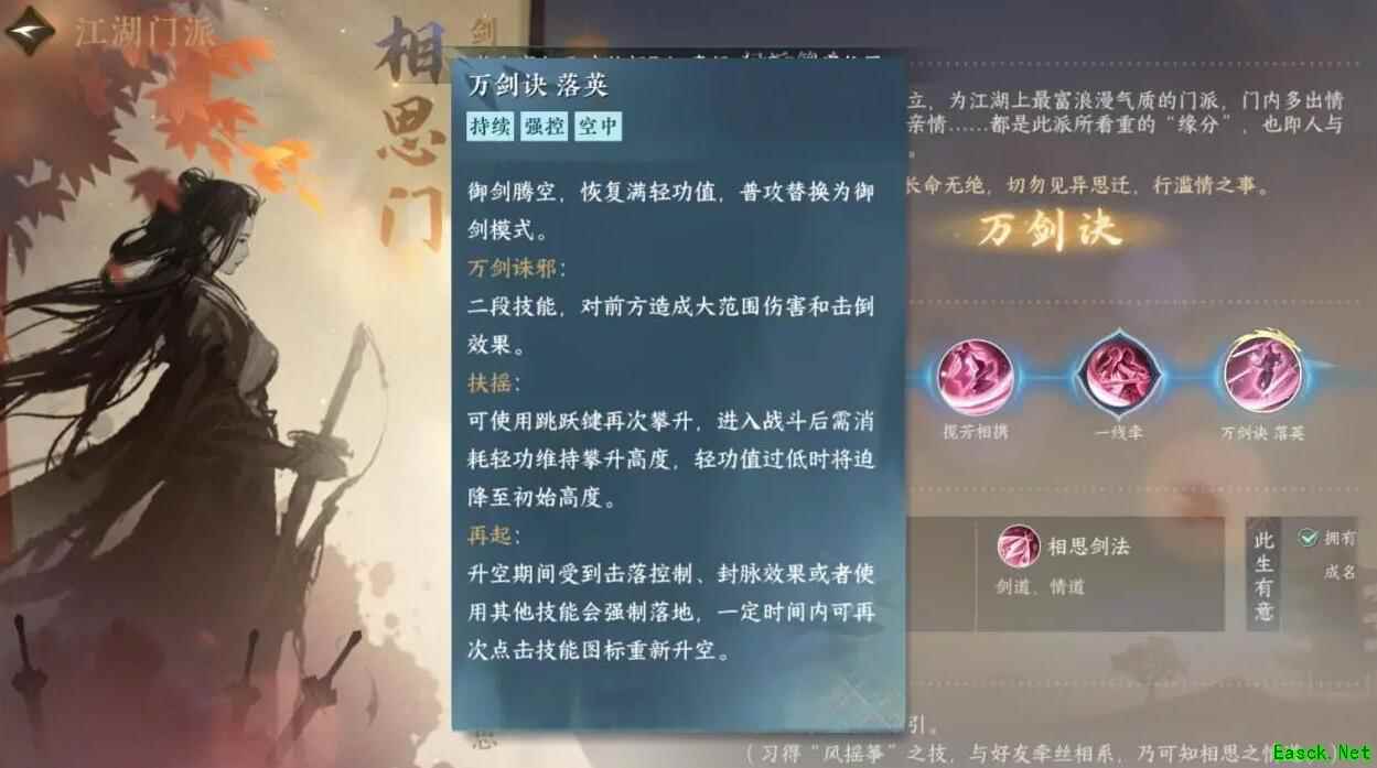 4、万剑诀落英 万剑诀是门派的镇派之宝,能够在释放该技能时施展出大范围性的伤害以及击倒效果。