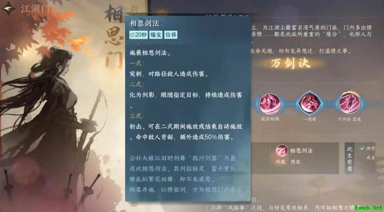 二、技能介绍: 1、相思剑法 该技能是一个支持位移效果的伤害性技能,玩家可以在游戏当中体验到非常强势的爆发性伤害。