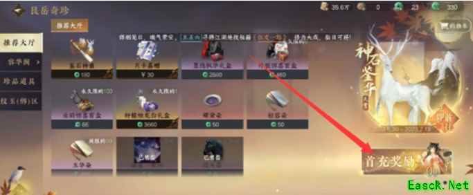 2、玩家可以在里面氪金购买自己喜欢的物品道具,第一次充值不仅有双倍奖励,还有首充奖励; 3、在商城的【推荐大厅】中,右下角的位置就有首充奖励,在第三个位置,如下图: