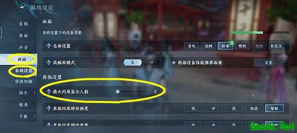 《逆水寒手游》屏蔽玩家方法屏蔽方法: 1、找到右上角的菜单 2、最右边的圆形按键倒数第二个设置 3、第四个设置选项画面-基础设置 4、画面-基础设置中找到最大同屏显示人数 5、把最大同屏显示人数改为0 这样就可以把别的玩家屏蔽掉啦,不过只会屏蔽模型,头顶的名字还是在的,不然后期pvp、pve可就完全看不到人了。 图解: