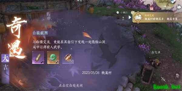 《逆水寒手游》白猿献图奇遇完成攻略奇遇:白猿献图 位置:桃溪村【944,1064】 触发:呼吸-武侠奇遇-白猿献图 传闻:桃溪村前桃花乡,桃花乡里桃花芳,摘得桃花酿成酒,桃花雪在树下藏。