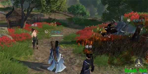 2、接着我们根据对话中的线索,护送镖师前往到下一个地点,然后就会出现劫匪,我们使用普通技能把劫匪吓跑即可。
