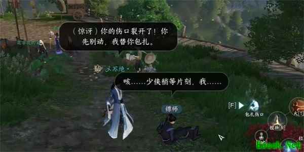 3、我们继续护送镖师到达下一个点位,接镖师就倒地受伤,我们需要帮镖师进行包扎即可。