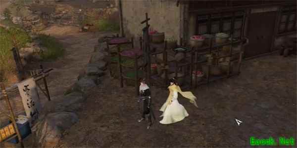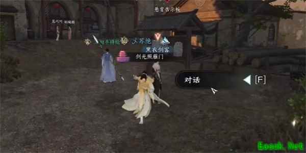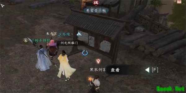 3、接着黑衣剑客会回答我们之后,就带他前行到告示牌的位置,让看查看告示继续与他进行对话。