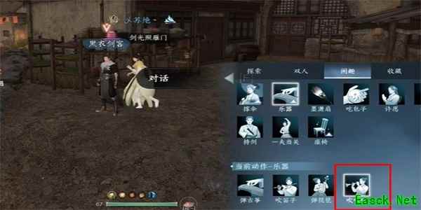 2、接着我们与黑衣剑客进行对话,不回答我们,所以需要引起他的注意【使用表情动作:吹唢呐】。
