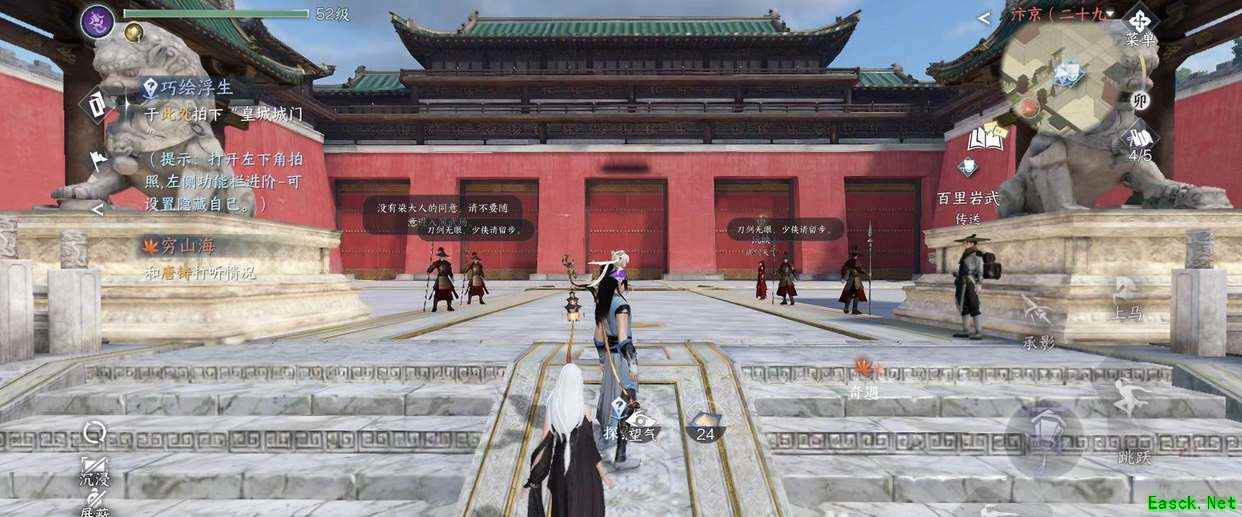 《逆水寒手游》巧绘浮生拍照任务攻略1、巧绘浮生拍照任务要求玩家前往汴京坐标(1017,665)皇宫门前拍照,必须能看到皇城门,台阶、石狮子,但是又不能太远导致画质模糊。 2、可以参考下图所示的位置来进行拍摄,拍摄好后即可完成任务了。