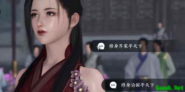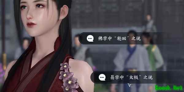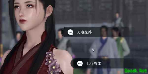 2、我们和谢鸳进行对话,对话结束后我们就可以开始选题了,第一题我们选择【李渤、李涉】第二个选择【修身齐家平天下】电梯我们选【天行有常】第四题我们选择【太极】;