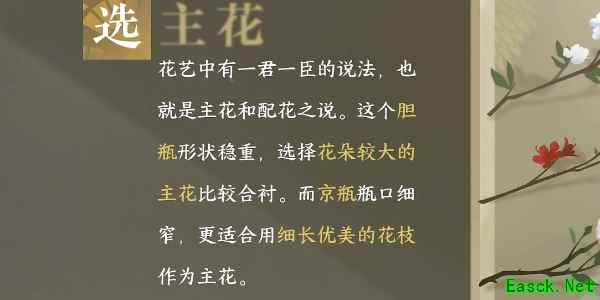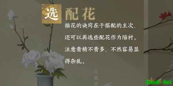 3、选题完成之后我们就要开始考核插花了,这个插花我们是可以随意搭配的看玩家自己的喜好花朵选择【1、4】配花可以随便选择;