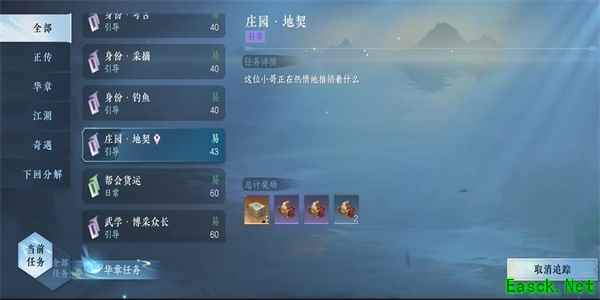 《逆水寒手游》庄园任务接取位置一览1、首先我们需要达到等级43级,才可以接取到庄园任务,接着我们就子啊全部里面找到【庄园地契】的任务。