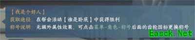 逆水寒手游我是个好人称号怎么获得获得方法: 在帮会活动【谁是卧底】中获得胜利。 目前这个称号的获得比较看概率,可能一把胜利就可以获得,也可能要好多把,这个玩家们只能多次尝试。