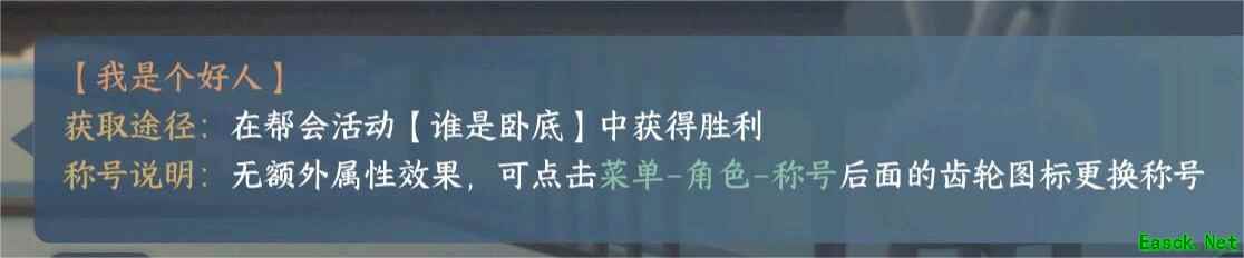 《逆水寒手游》我是个好人称号获取方法目前帮会活动中获得这个称号的方式比较概率,小伙伴可以多次尝试游玩这个模式获得。 获得方式:在帮会活动【谁是卧底】中获得胜利。