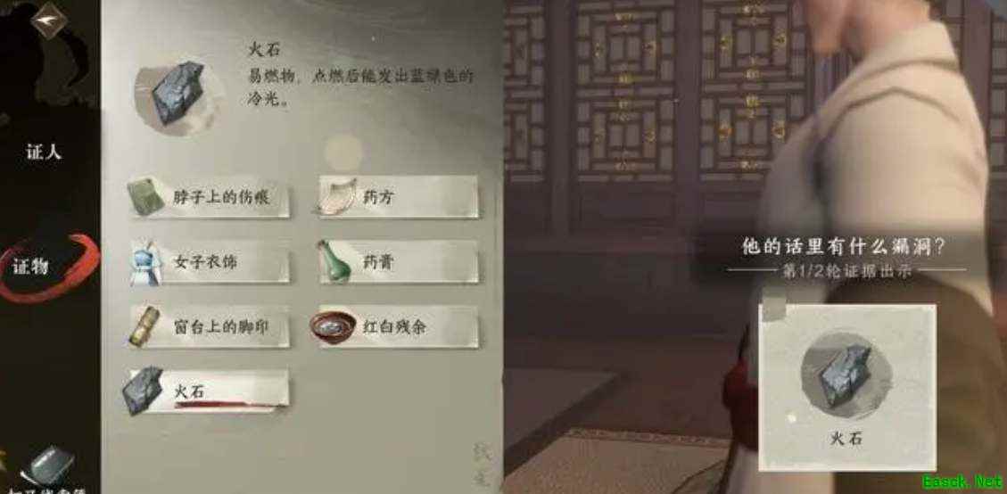 4、第二个出示的证据为“证人,贾晟,北境商旅” 5、第三个证据出示“证人,辜慎行,走南闯北” 6、第四个证据出示“证人,周允,剧毒之药” 7、第五个证据出示“证人,沈枯红,死因不明” 8、第六个证据继续出示“证人,阿正,如出一辙” 9、第七个证据出示“证人,阿梅,不敬亡者”
