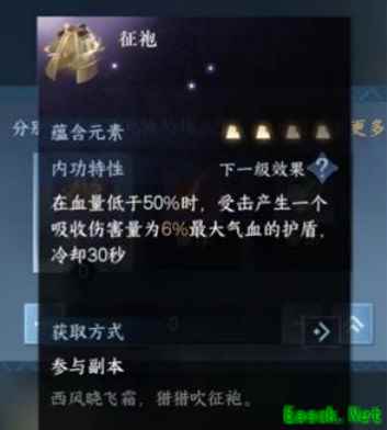 《逆水寒手游》内功自选礼盒各内功效果详解1、征袍: 蕴含元素:土*4 内功特性:在血量低于50%时,受击产生一个吸收伤害量为6%最大气血的护盾,冷却30秒 推荐选择:铁衣/素问 铁衣作为唯一肉盾,征袍在低血量下提供的护盾可以缓解铁衣的生存压力; 素问推荐选择征袍,毕竟再高的奶量如果站不住也将毫无意义;
