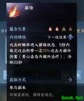 2、摧锋: 蕴含元素:火、火、金、火 内功特性:攻击时概率进入摧锋状态,5秒内每次攻击附带一次10%攻击力额外伤害(素心姿态为额外治疗 ),冷却20秒 推荐选择:碎梦/PVE玩家 超快的攻速配合摧锋触发后5秒内每次攻击提高的伤害,使碎梦如虎添翼; PVE玩家选择摧锋可以提高对怪物造成的伤害;