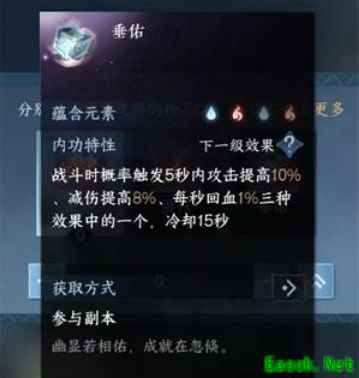 3、垂佑: 蕴含元素:水、火、水、火 内功特性:战斗时概率触发5秒内攻击提高10%、减伤提高8%、每秒回血1%三种效果中的一个,冷却15秒 选择推荐:血河/神相/九零/PVP玩家 血河/神相/九零/PVP玩家选择垂佑同样是提高生存能力。