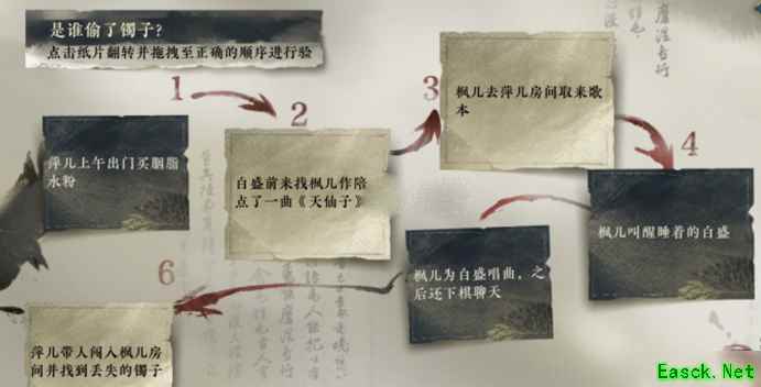 逆水寒手游巧觅贼踪怎么过1、推理顺序: ①萍儿上午出门买胭脂水粉。 ②白盛前来找枫儿作陪,点了一曲《天仙子》。 ③枫儿去萍儿房间取来歌本。 ④枫儿叫醒睡着的白盛。 ⑤枫儿为白盛唱曲,之后还下棋聊天。 ⑥萍儿带人闯入枫儿房间,并找到丢失的镯子。 2、结论:白盛是恶人。 3、证明白盛接触过镯子——出示证物:手镯。 他的话里有什么漏洞——出示证人:梁妈妈【欢场熟客】。 证明枫儿与萍儿的关系——出示证人:萍儿【怒发冲冠】。 萍儿违和装出友善——出示证人:梁妈妈【后起之秀】【关于萍儿】。 他的话里有什么漏洞——出示证人:枫儿【前后差异】。 他的话里有什么漏洞——出示证物:酒壶。
