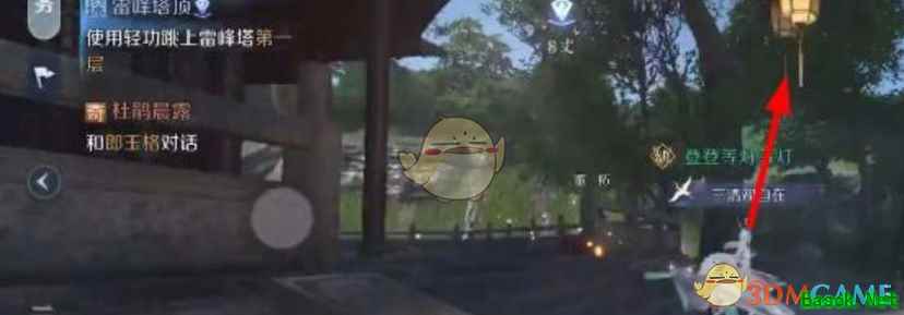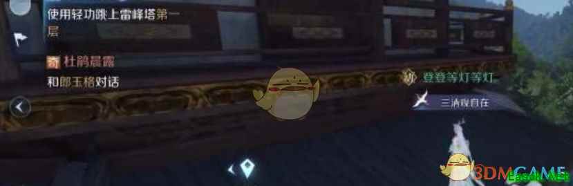 2、之后前往杭州的雷峰塔,玩家需要使用轻功来登上塔顶,或者是利用利用周围灯笼的钩绳来登上塔顶,还有一种方法就是与底下的董传拓进行对话并交付2000交子即可直接到达塔顶。