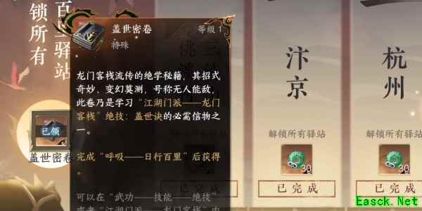 4、得到盖世密卷。打开呼吸里的日行千里,将里面的地图驿站全部解锁就可以获得盖世密卷。