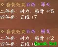 当然也有运气不好的玩家,根本没掉几件浑天。 这时候如果是铁衣那可以选择【2浑天+2横戈】2+2的套装效果可以给铁衣的+27点根骨耐力。 输出的话凑不齐【浑天4件套】可以选择【横戈4件套】五维+7的效果,因为头腰鞋护腕这些装备的属性都是气血防御相关,作为输出可以暂时不用这些词条,优先凑出4件套的效果。