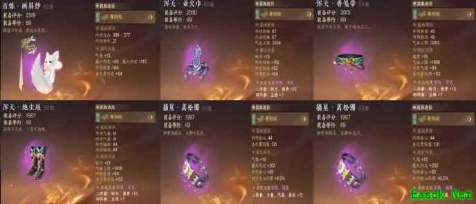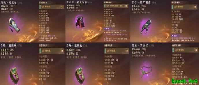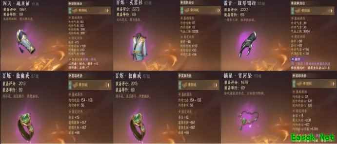 护腕【浑天-疏星袖】衣服【百炼-玄嚣衫】手套【雷音-鼓琴银指】戒指【百炼-独幽戒*2】项链【摘星-宵河坠】