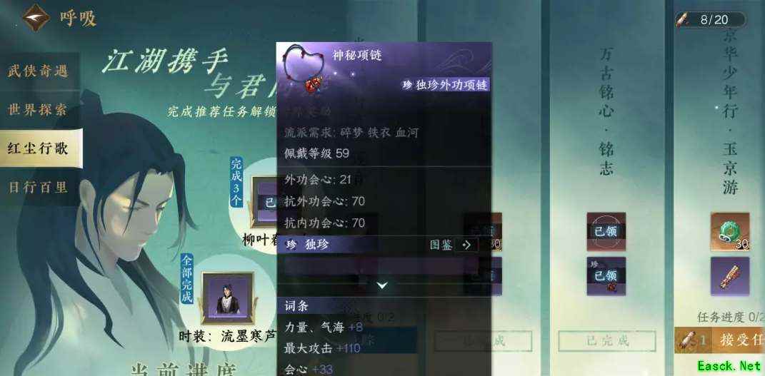 《逆水寒手游》幸运项链分解后找回方法1、幸运项链铭心/殉古是通过完成呼吸里面【红尘行歌】万古铭心的任务获取的,两个项链的属性加成一样,可以提升10点幸运值;