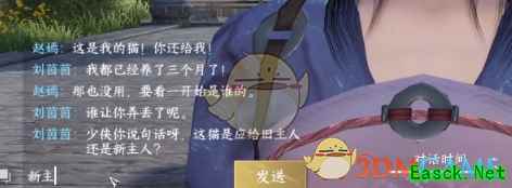逆水寒手游抢猫奇遇任务:1、首先前往汴京(977,1128)的位置,找到NPC刘茵茵对话,对话结束后既可接取任务了,需要玩家在旁边听取猫咪到底归谁。
