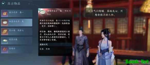 4、找到杭州(954,795)的何悠月人物,选择出示之前的“张老板的菜谱”,并根据对话选择“新鲜莲藕”和“回到甜水巷”。