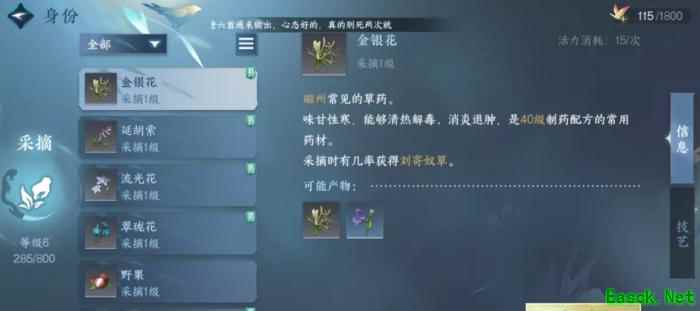 采摘每次消耗活力15点,每次可得到2到3朵金银花,但是概率获得刘寄奴草/一级残破舞谱/高级饵 这里经过几木测试 采集金银花约一百三十次 共得金银花264朵,刘寄奴草19个,高级饵19个,一级残破舞谱7个,总价值约三万五千铜币 经过几木计算每天采集大约可得8100铜币,每月可赚二十四万四千铜币! 四:工艺技术