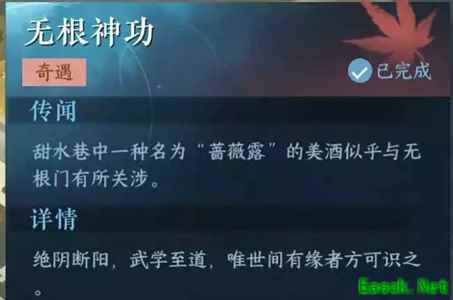 《逆水寒手游》无根神功任务流程一览任务类型:奇遇任务 奇遇等级:小吉 任务位置:【杭州】坐标(957,1342) 任务npc:【邓宝扇】 前置任务:完成前置奇遇【锦伞红衣】 具体流程: