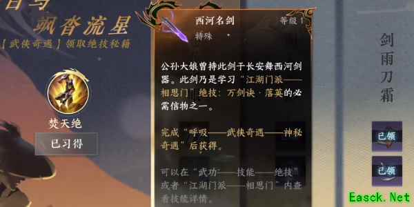 二、西河名剑 1、西河名剑获取需要完成奇遇任务苍龙之眼后得到的奖励。