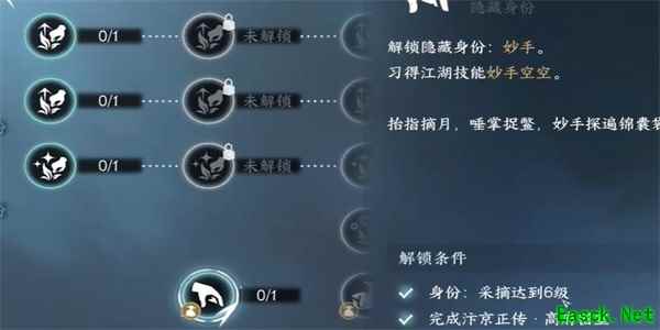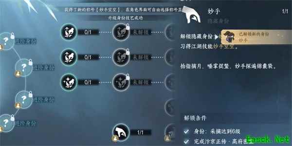 4、然后我们就可以看到解锁隐藏身份:妙手,我们满足一定的条件之后,就可以成功的解锁妙手空空的技能了。