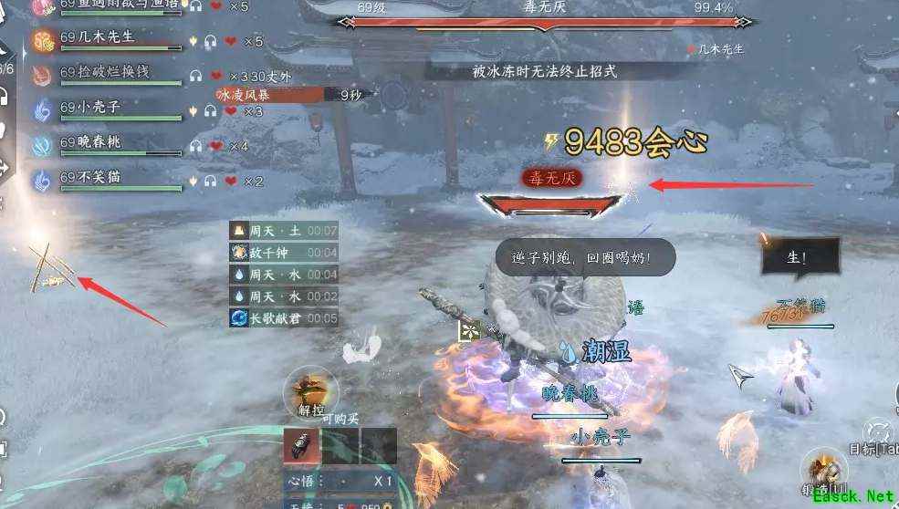 4、BOSS毒无厌:T将BOSS拉到周围的篝火旁然后在输出,注意不要让寒意词条蓄满,否则会被冰冻。被冰冻的话可以让队友释放火属性技能解控。挑战过程中会出现舞阳老六的分身,可以提前携带好【八卦图解毒】技能应对。