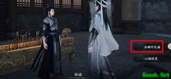 3、那么后面的话杨诚就是会到达磁州孔庙【1058,763】这个位置,到达后是跟杨诚进行对话。 4、那么在对话中玩家是得知杨诚是想要多停留几日在这里参拜,那么下面玩家就是需要点击祝你顺利。