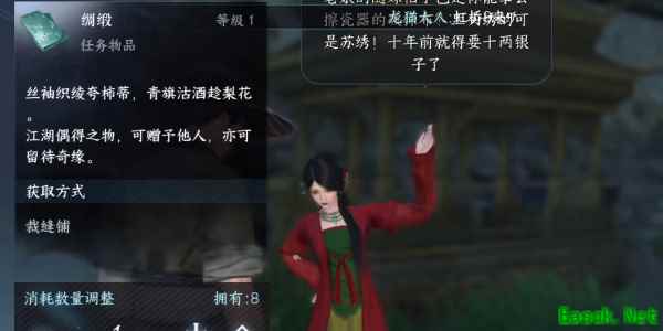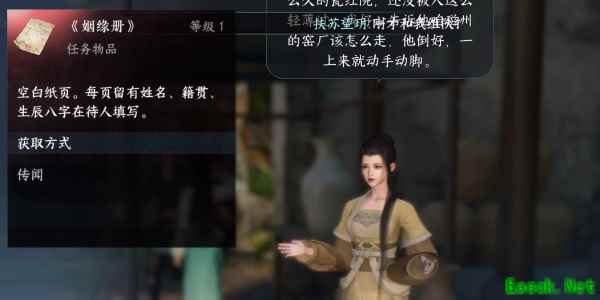 2、我们将一条绸缎交给需要它的裘碧唐,之后我们再和她对话从她手中得到一本册子帮她挑选出色的女孩。