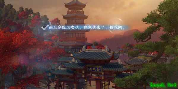 2、跟随游戏镜头移动点击中间的光点根据意象写出第一句(雨后庭院风吹尽,晓寒犹未了,馆花阴。)。