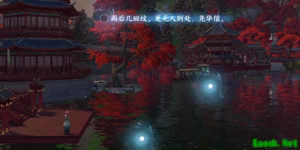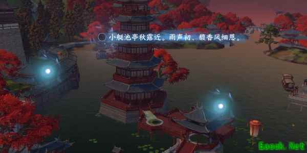 3、接着随游戏镜头移动点击中间的光点根据意象作出第二句(小艇池亭秋露近,雨声初,馥香风细恩。)。