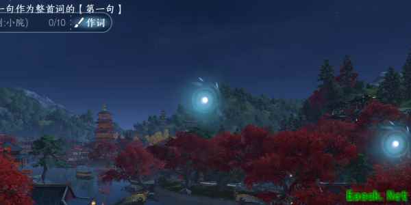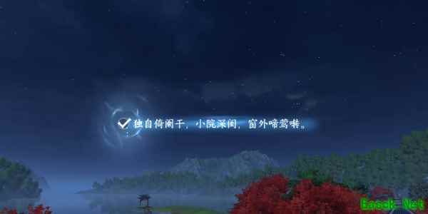 6、再次跟随游戏镜头移动,选择中间光点以意象作出下一句(独自倚阑干,小院深闺,窗外啼应啭)。