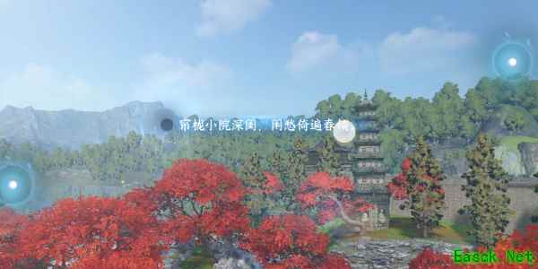 2、随镜头转动见到新的意象点击右边光点写出第一句词(江山流水,一川烟雨,长为谁留住说。)。
