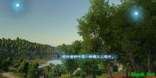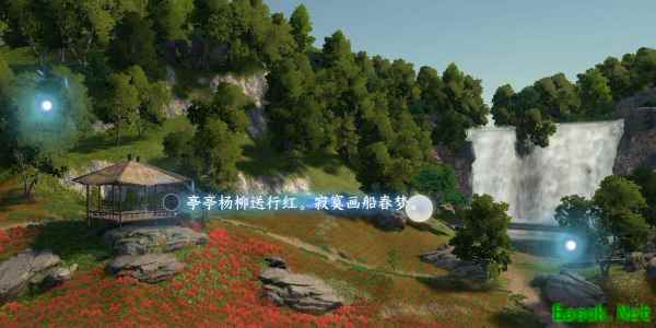 3、随着镜头移动我们可以看见一处凉亭,我们根据亭子作为意象选择中间光点写出第二句(亭亭杨柳送行红,寂寞画船春梦。)。