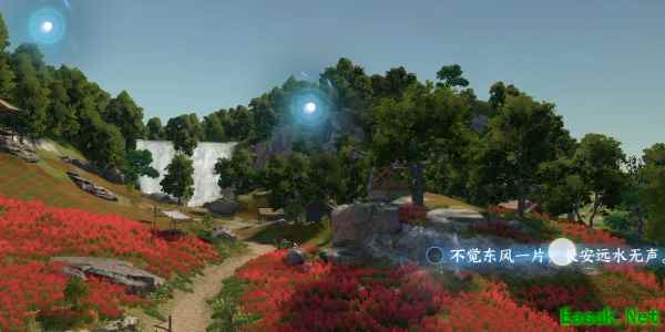 2、游戏镜头拉伸到空中可以看见瀑布,我们根据此时的意象点击右侧光点写出第一句(不觉东风一片,长安远水无声。)。