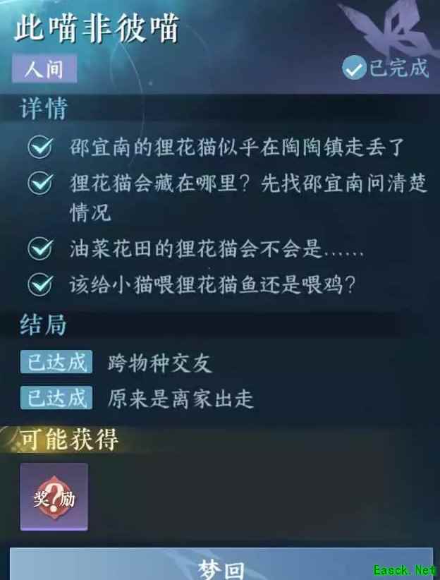 3、提交叫花鸡鸡对应结局“原来是离家出走” 4、提交鱼类食物对应结局“跨物种交友” 注:本任务梦回不会退回“猫形瓷哨”,需要再次梦回人间·一念执意获取 二、任务奖励 3点剧情点,2点风云令和2个绑玉 结局“跨物种交友”额外奖励: 成就「喵喵喵?喵喵喵!」